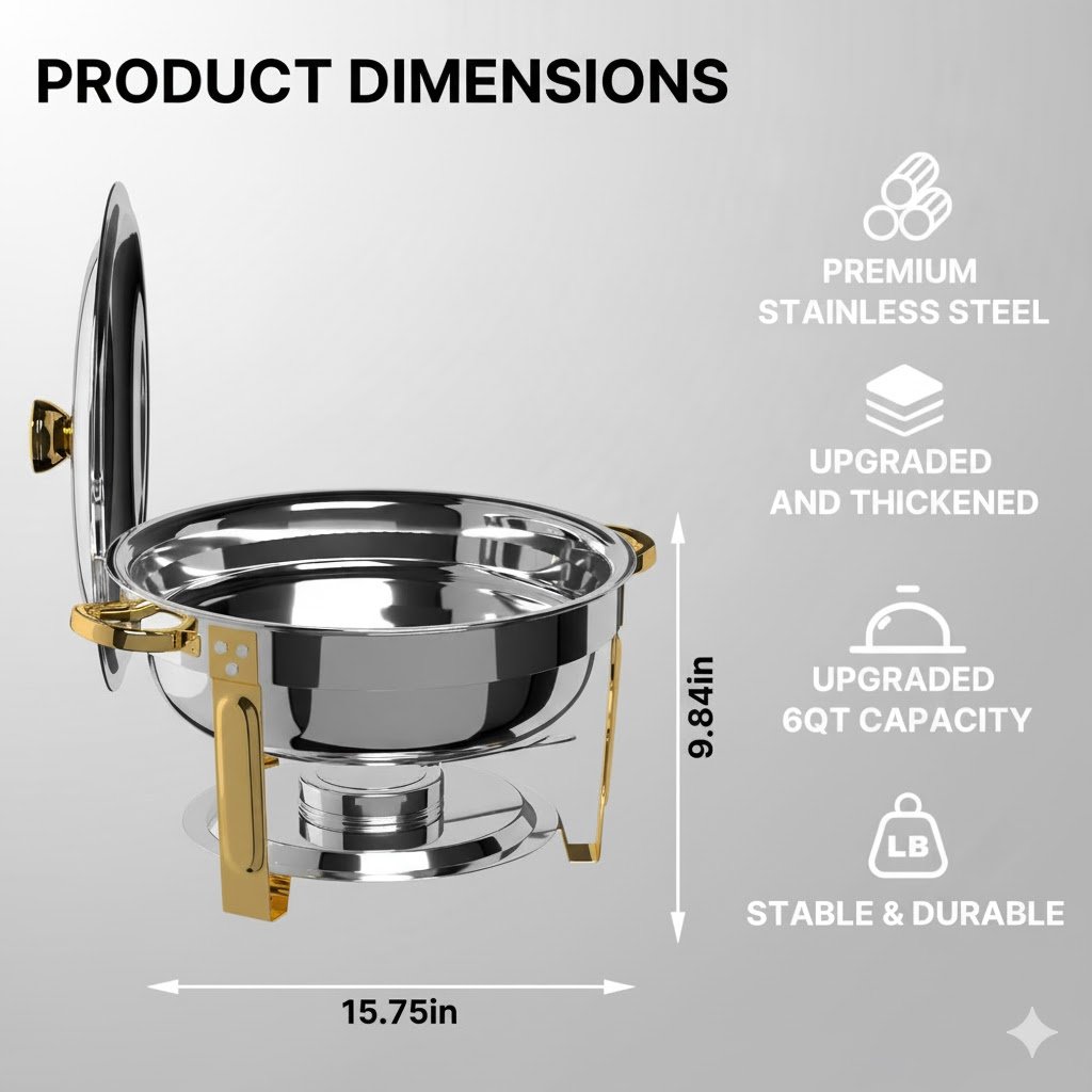 With its stunning gold-and-silver finish, premium stainless steel build, and flawless heat performance, this set combines practicality with elegance. It helps you host confidently, knowing that your dishes will look beautiful and taste perfect no matter how long the party lasts. If you enjoy bringing people together around food—and want to do it in style—this is one product that will truly elevate your hosting game.
