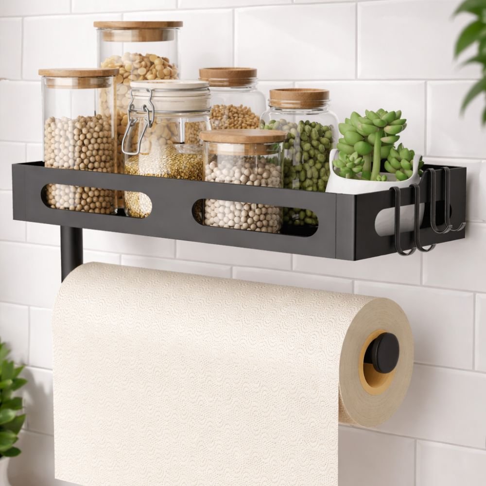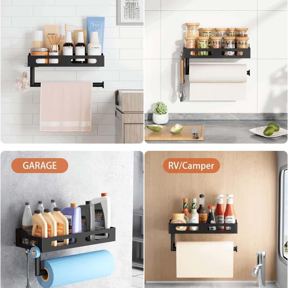 This Paper Towel Holder Wall Mount is a smart, stylish, and highly practical upgrade for modern U.S. kitchens, bathrooms, and RVs. Designed with a one-handed tear system, it makes everyday cleanup faster and more convenient, while the built-in shelf and four hooks add valuable storage without taking up counter space. The matte black finish delivers a premium, modern look that blends perfectly with today’s kitchen designs.