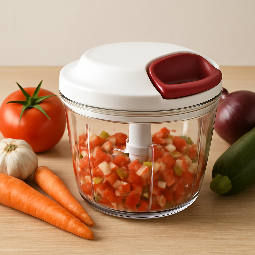 A compact manual food processor designed for quick, uniform chopping without electricity. Ideal for everyday use and traveling.